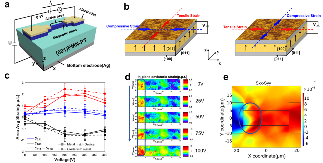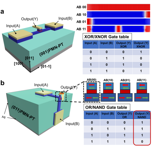 在众多磁性材料中,多铁材料具有独特的优势,因为它是由铁磁和铁电异质结构组成,具有显著的磁电效应,可以在非常低的能耗下实现快速和高密度信息存储。基于多磁材料特性,该研究主要实现了以下三个方面的技术突破:(1) 制备了基于磁畴运动的特殊图案化及结构的多铁性Ni/PMN-PT异质结逻辑器件。(2) 通过COMSOL和面向对象微磁框架进行了数值和微磁模拟,证明了电场对铁磁畴壁的产生、传播和终止模式下的影响。(3) 提出了两种不同的器件结构,并分别实现了异或、同或以及或和与非门的逻辑功能。