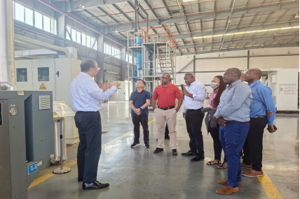 氢阳能源程寒松教授向南非代表团介绍了有机液体储氢技术的优势,带领大家参观了基于有机液体储氢技术开发的燃料电池大巴车、储氢材料中试生产基地。