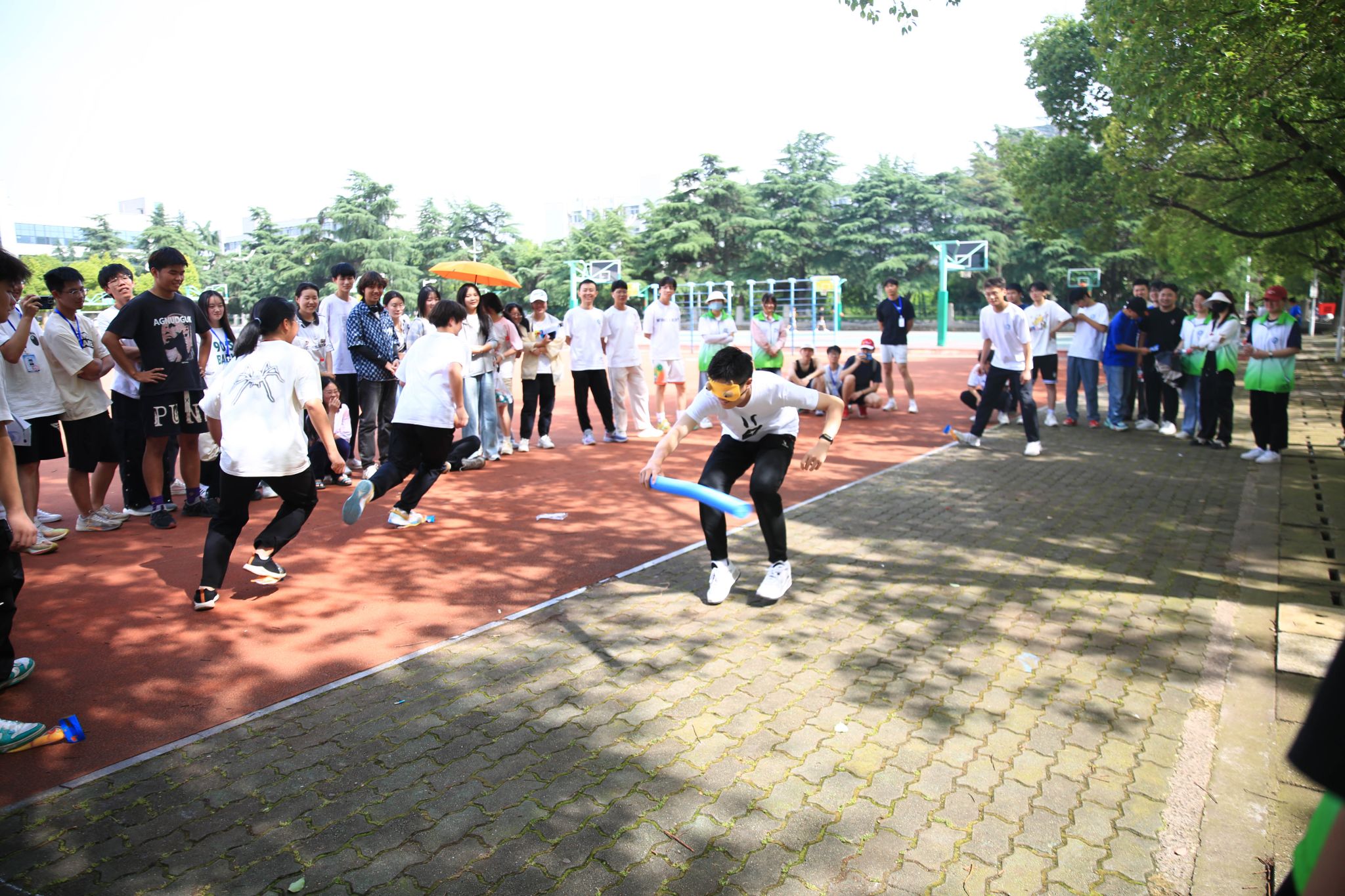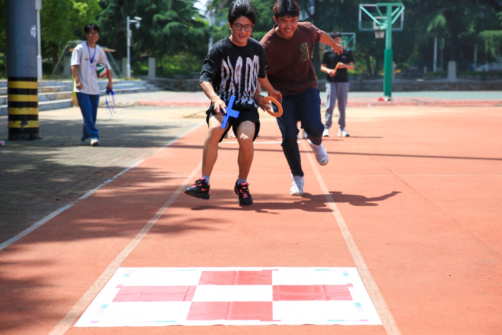 今年的运动会除开展同心鼓、跳大神、套圈等趣味项目和接力、跳远等田径项目外,还设置了集智力与体力一体的趣味三子棋和电子打靶,吸引了众多师生前往体验。