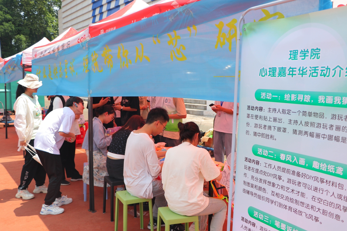 5月24日,湖北工业大学校心理中心联合各学院在操场举办了以“五育润心,沐光同行”为主题的心理嘉年华活动,理学院设置“一站式”社区分会场,面向全院学生开展“笔墨诉忧,魔术解愁”“绘影寻踪,我画我猜”“春风入画,趣绘纸鸢”等充满趣味的心理互动活动,让同学们在轻松的气氛下愉悦身心,学会自我关怀,培养积极心态。