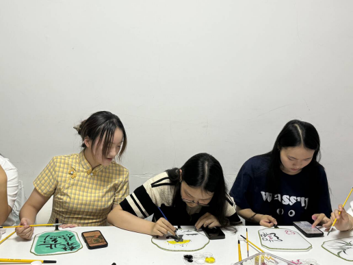 团扇绘画和草帽编织活动现场,同学们化身“艺术家”,开始了自己的奇思妙想,他们时而沉浸于自己的创作,体验“匠心如初”的心流状态;时而与同伴分享心得,在交谈中舒缓焦虑,提升艺术素养。